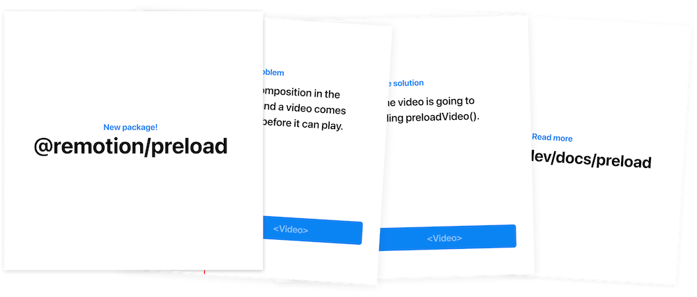 In addition to the Preload APIs, prefetch() presents another way of preloading an asset so it is ready to display when it is supposed to appear in the Remotion Player.